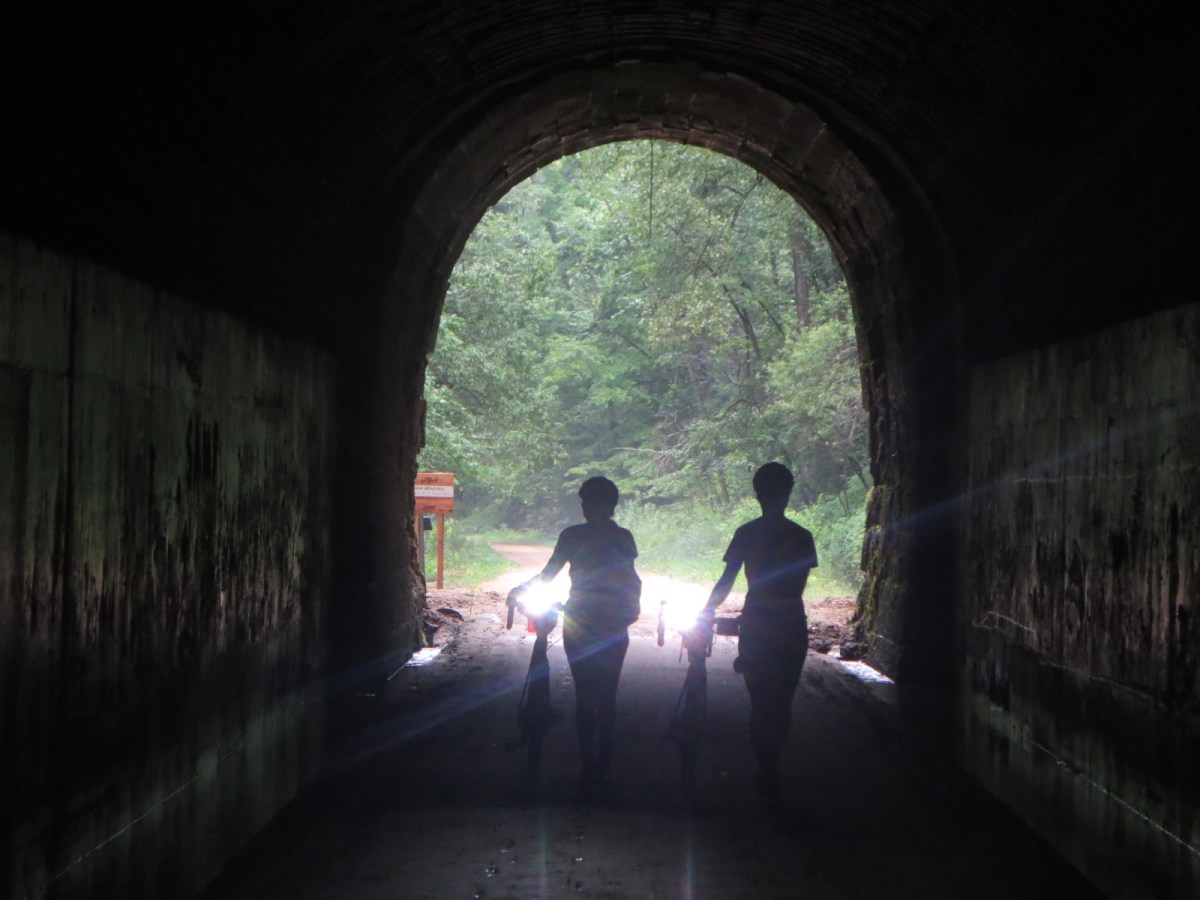 Today’s ride feature was the Elroy-Sparta rails-to-trails bike path that included three massive rock tunnels that cut through their respective mountains. Cars can drive up and over, but trains need a steady grade. The first tunnel was almost one mile long and it was absolutely pitch black once inside. Audrey (being a teacher) educated us that when it’s pitch black, you can’t be sure if your eyes are open or closed. So, our headlights (and for me, a bright LED flashlight) came in handy.